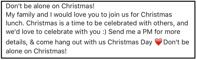 Who are you spending Christmas with? Who could you check in with? To whom might you extend an invitation to ensure they’re not lonely this Christmas?