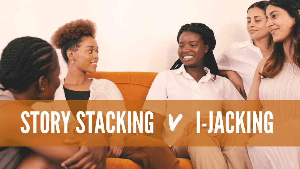 So, the trick is knowing how to spot a story stacking moment and how to avoid I-jacking (intentionally or otherwise). It’s a nuanced business but, generally, a story stacking moment is about light hearted or objective things. Like funny Zoom stories or tales of wardrobe malfunctions. If the topics are more personal, deep or reflective, or are initiated by the serious questioning of someone in the group – that’s not the time for story stacking. We must hold space for an individual to share fully and be responded to appropriately.